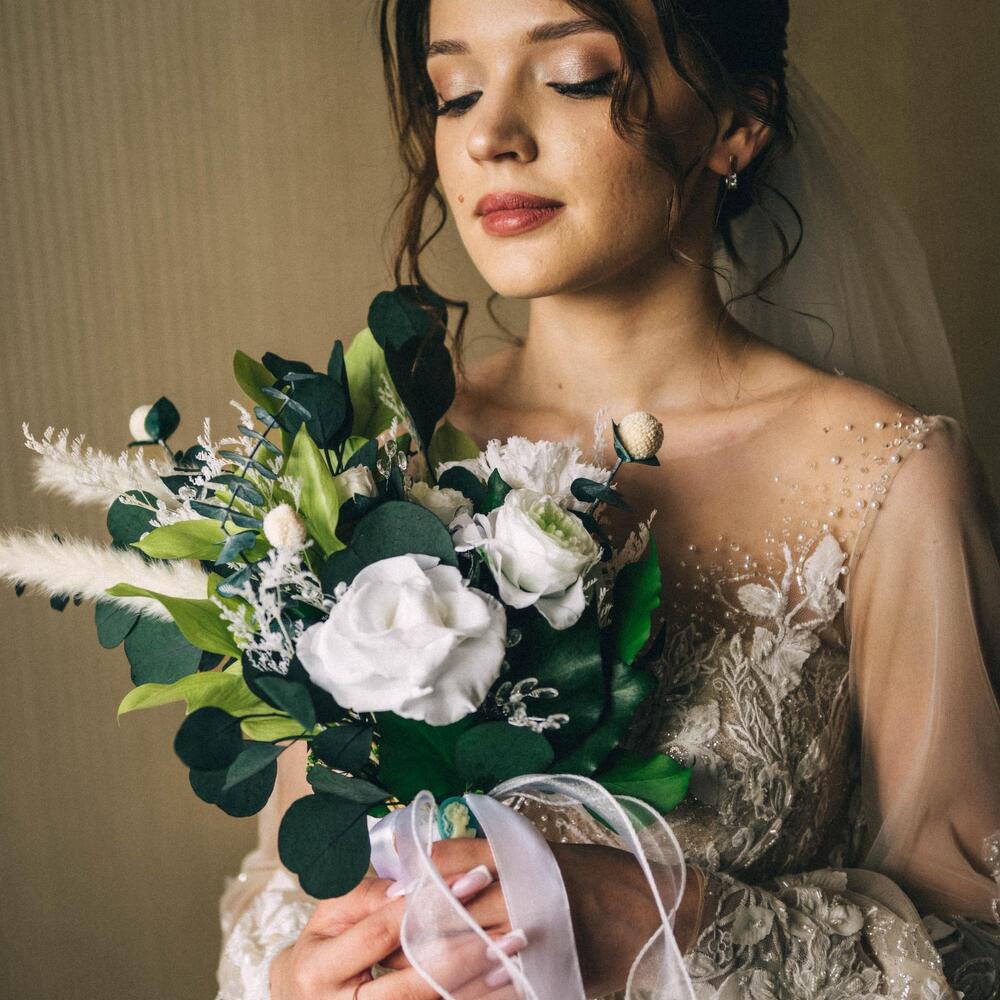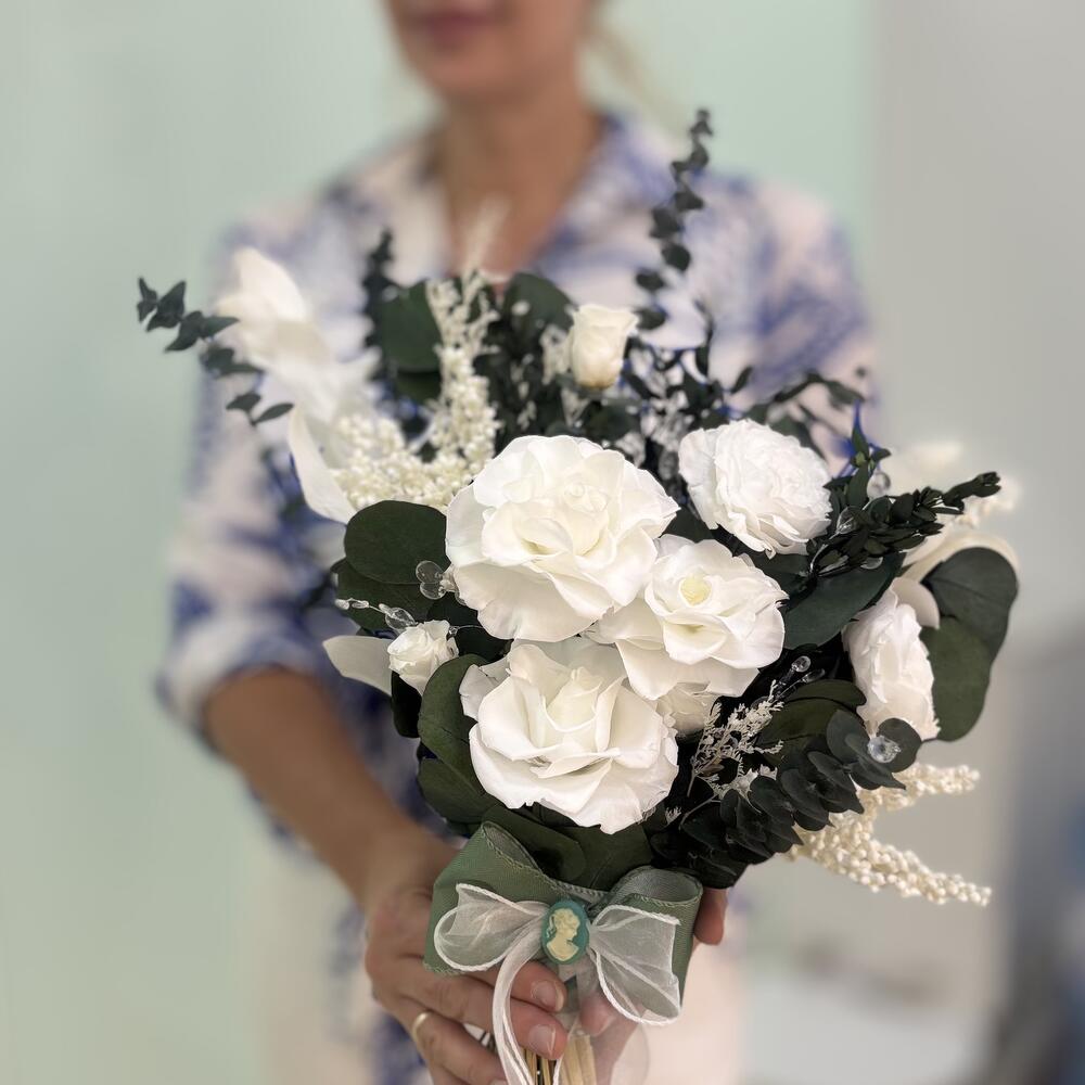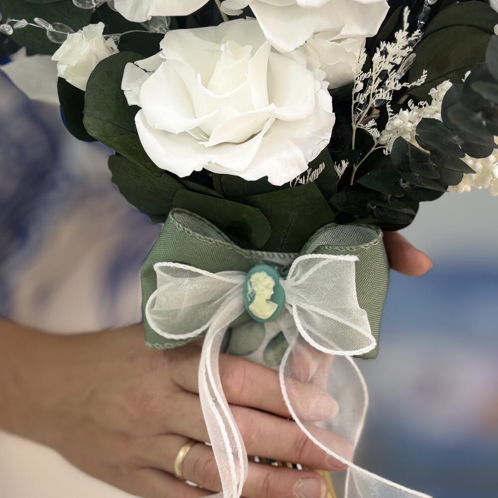 Stabilized Rose - 5 pcs Stable hydrangea - 1 pcs Stable chrysanthemum - 1 pcs satin double bow - 2 pcs стабилизированная зелень микс - 5 pcs