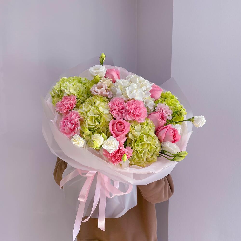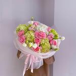 Hydrangea - 5 pcs Eustoma - 3 pcs Dianthus - 5 pcs peony - shaped roses - 5 pcs