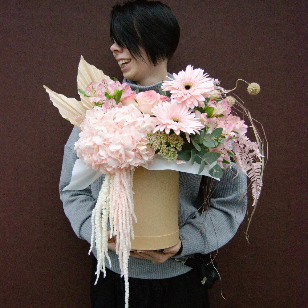 Alstroemeria - 3 pcs Matthiola - 3 pcs Rose - 3 pcs Gerbera - 2 pcs Oasis - 1 pcs Amaranth - 1 pcs Eucalyptus Mix - 1 pcs Tube - 1 pcs fern - 1 pcs