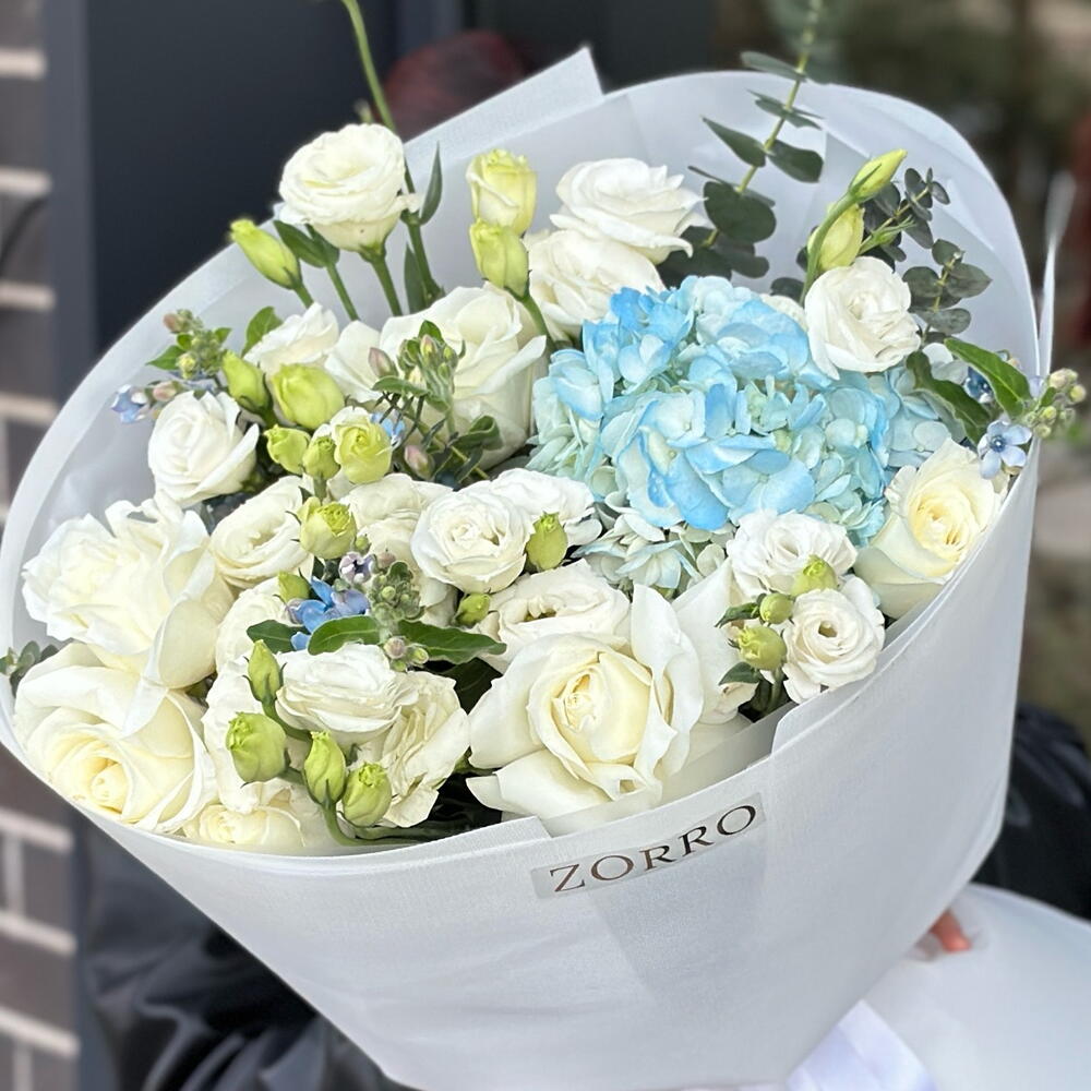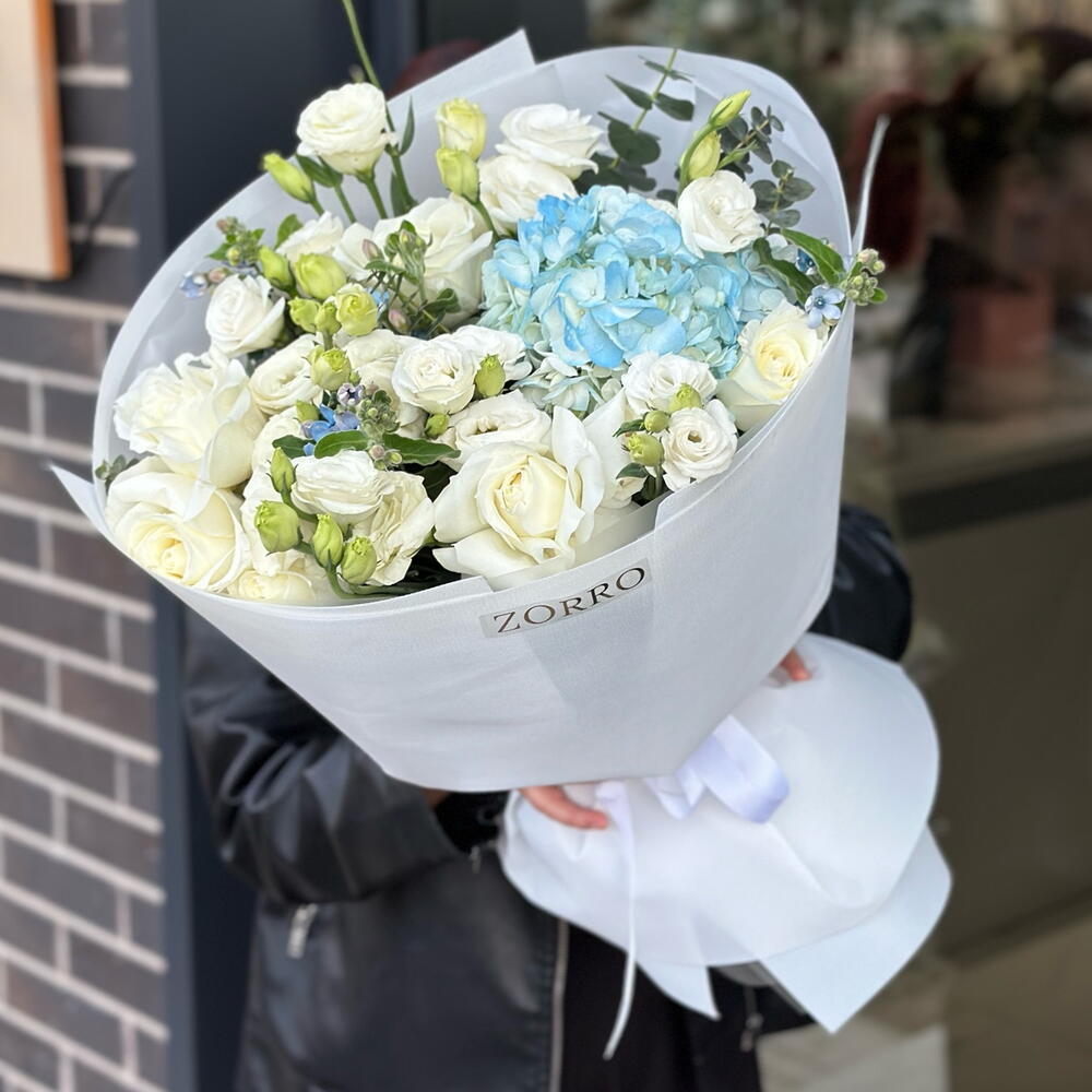 Hydrangea - 1 pcs Rose - 5 pcs Eustoma - 5 pcs The language of the input text is Russian, and it translates to "Tweedie" in English. - 4 pcs