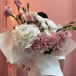 Hydrangea - 1 pcs Chrysanthemum - 1 pcs Carnation - 5 pcs Eustoma - 1 pcs