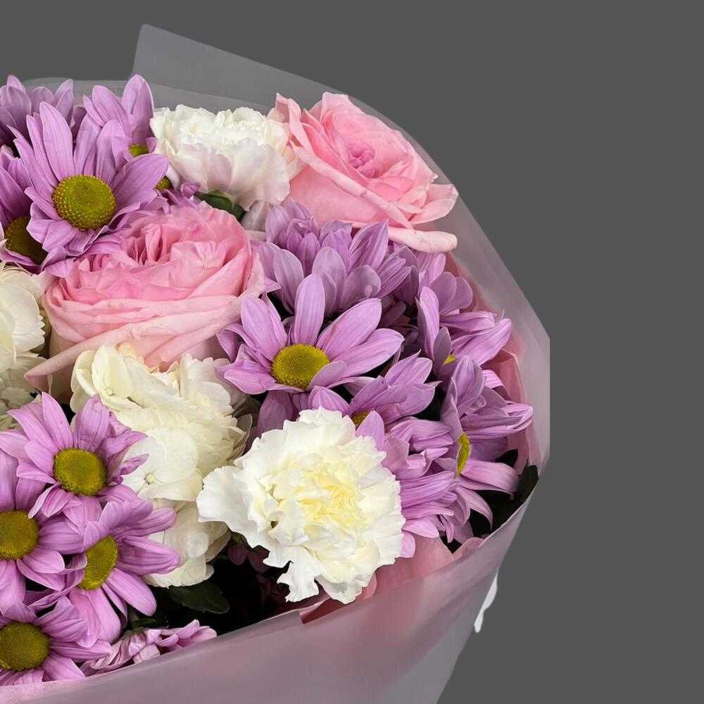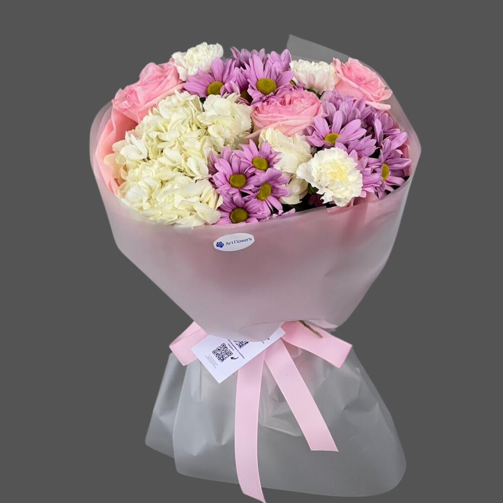 Hydrangea - 1 pcs Bush chrysanthemum - 3 pcs Carnation - 3 pcs Peony - shaped rose - 7 pcs