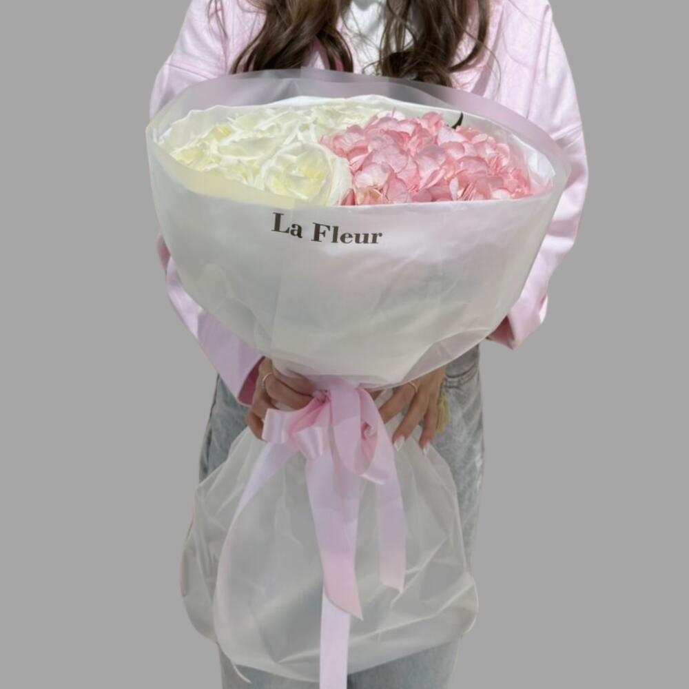 Белоснежные розы и розовая гортензия — воздушная композиция, полная света и спокойствия. Идеально для свадьбы, Дня матери или утончённого подарка.
