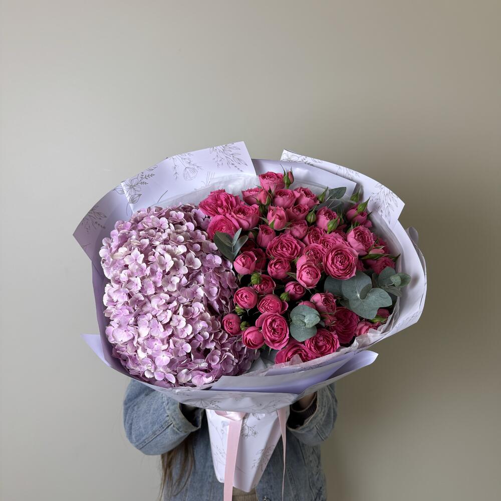 Вдохновение Объемный букет из гортензии розовых кустовых роз – гармония нежности и силы, дарящее вдохновение и радость каждому дню.