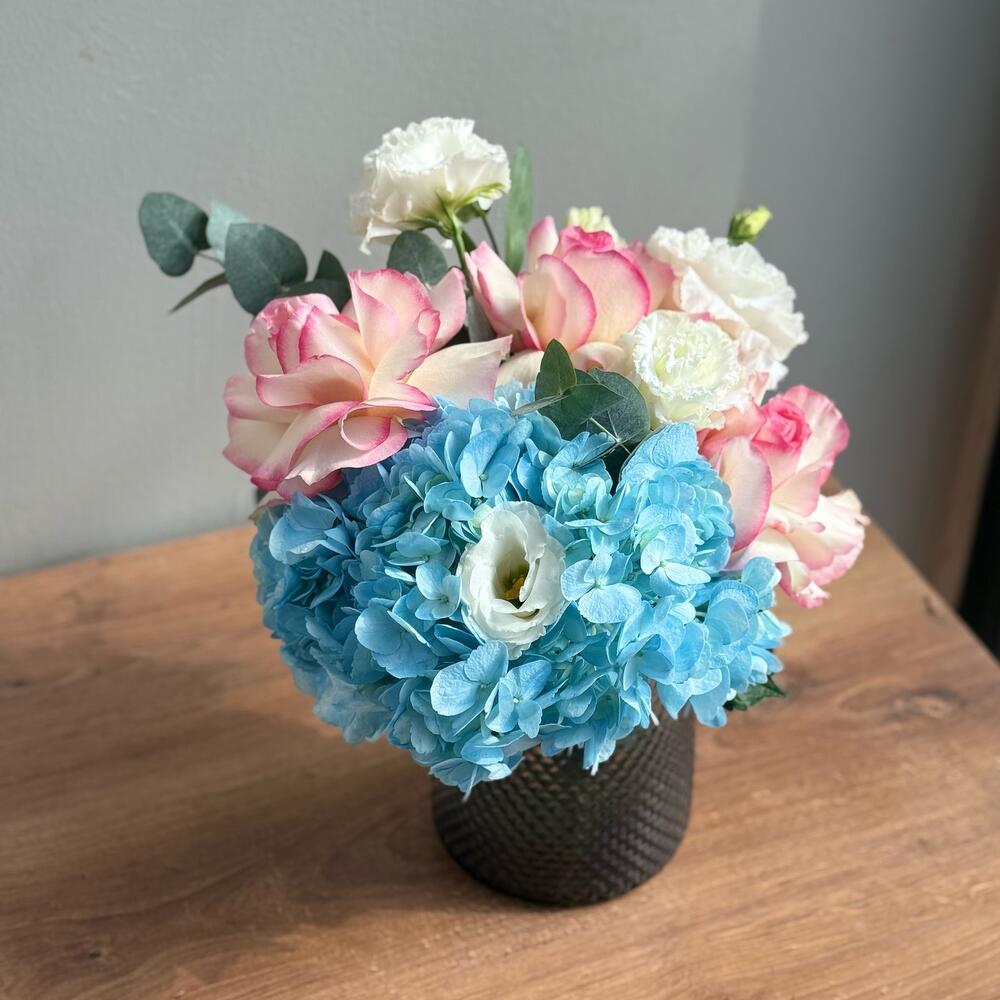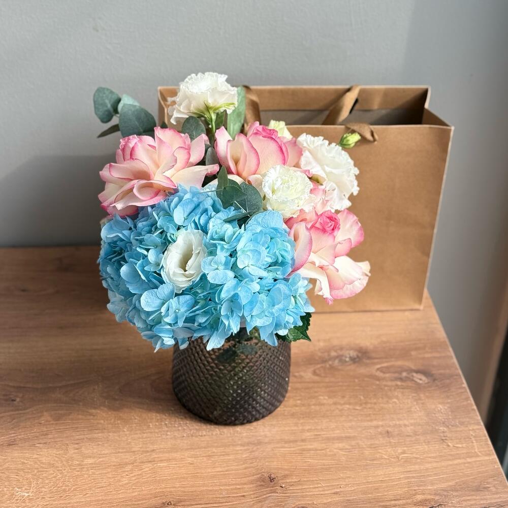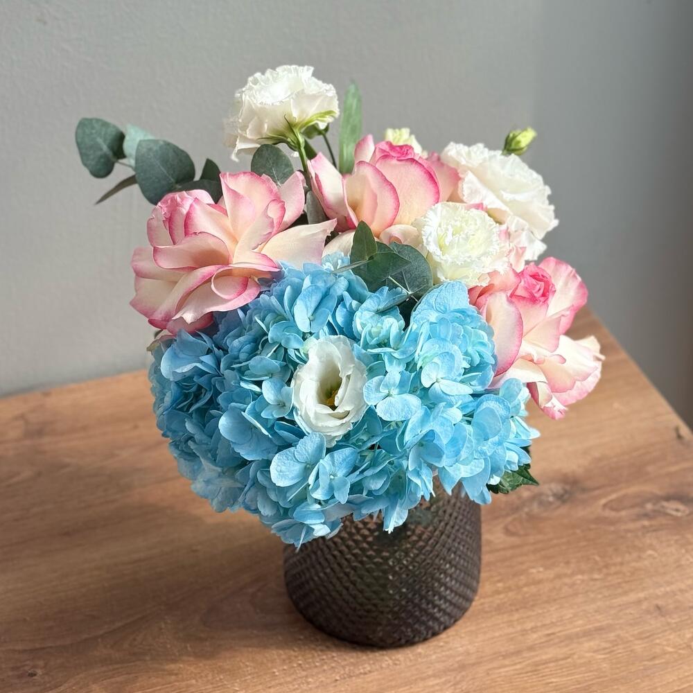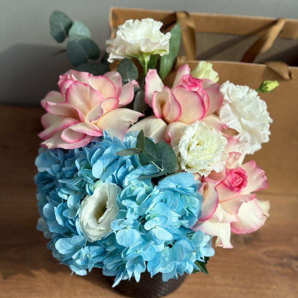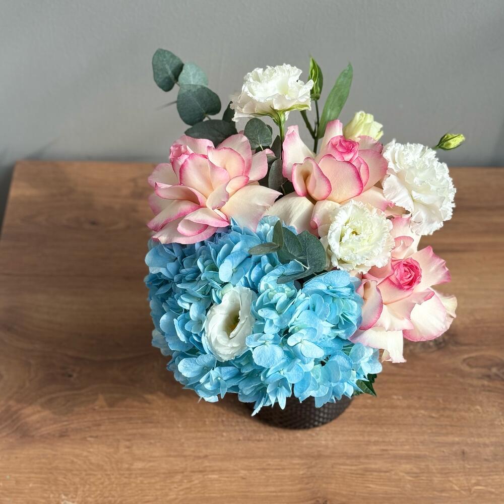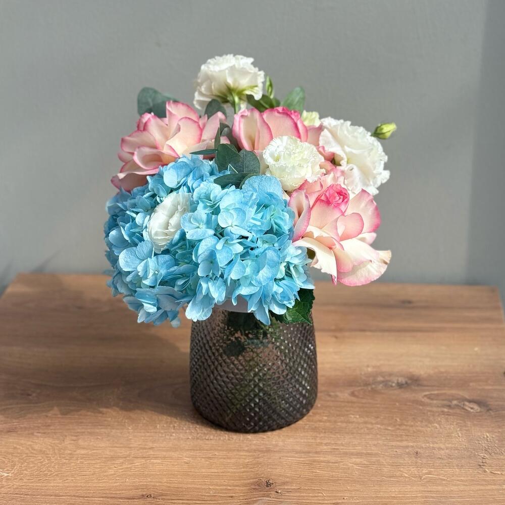 Hydrangea - 1 pcs Lisianthus - 1 pcs Eucalyptus - 1 pcs Rose - 3 pcs Vase glass - 1 pcs
