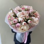 An incredibly delicate bouquet in shades of cream and powder pink. Lush garden roses and spray rose buds create the effect of a light floral cloud, while the matte wrapping softly accentuates the composition's refinement.