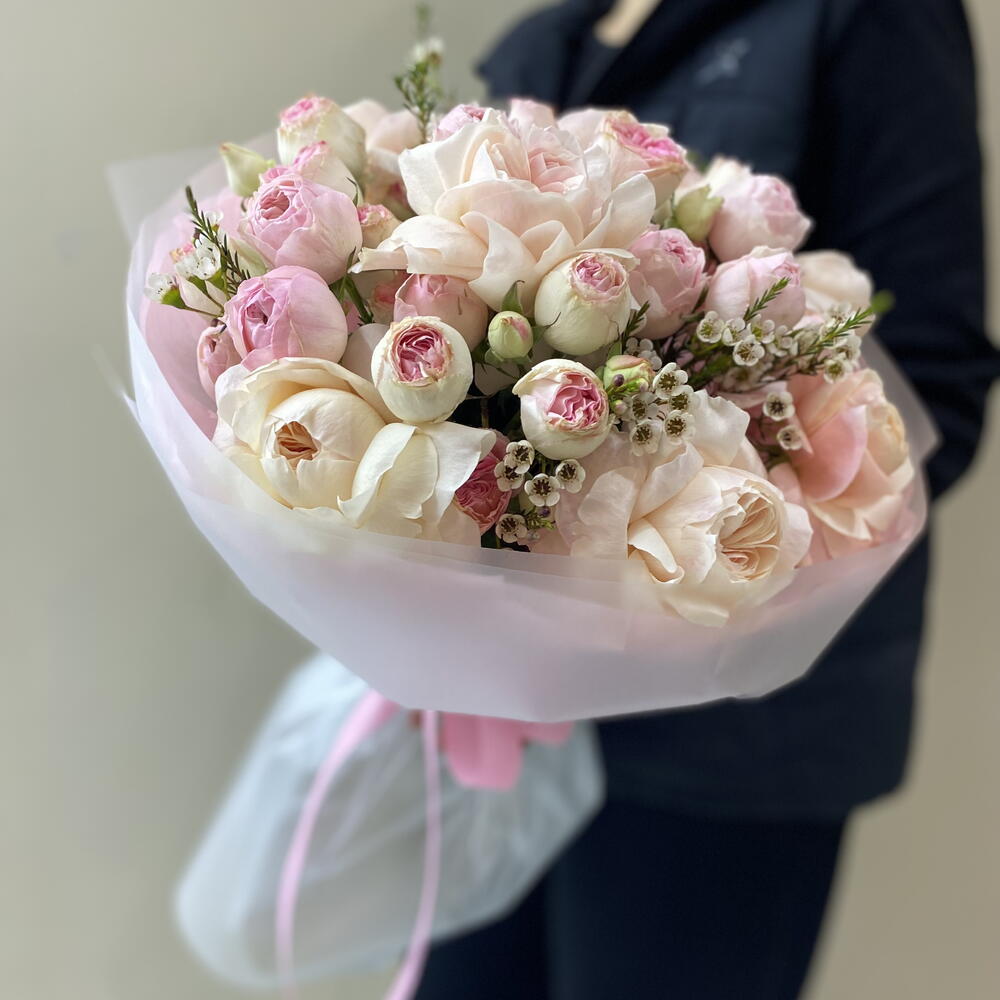 An incredibly delicate bouquet in shades of cream and powder pink. Lush garden roses and spray rose buds create the effect of a light floral cloud, while the matte wrapping softly accentuates the composition's refinement.
