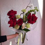 Lily - 1 pcs Dianthus - 4 pcs Designer packaging - 3 pcs Aquabox - 1 pcs Molucella - 1 pcs rose explorer - 4 pcs Corylus Contorta - 2 pcs