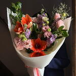 Amaryllis - 2 pcs Matthiola - 4 pcs The language is Russian. Here is the translation to English: "Ruscus" - 2 pcs Eustoma - 5 pcs Genista - 1 pcs