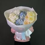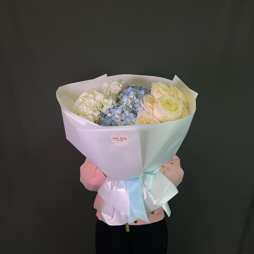 Это роскошный букет из пиновидной розы и гортензии, букет в котором слова излишни , ведь премиум цветы сами говорят о своих чувствах