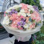 Hydrangea - 3 pcs Matthiola - 3 pcs Chrysanthemum bush - 6 pcs Rose - 5 pcs Carnation - 4 pcs Oxypetalum - 5 pcs Spray rose - 5 pcs