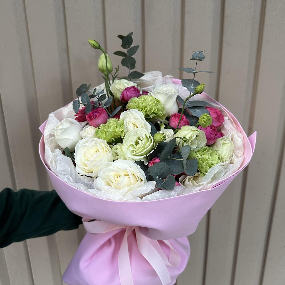 Eucalyptus - 4 pcs Rose - 9 pcs Bush rose - 3 pcs Carnation - 3 pcs Eustoma - 3 pcs
