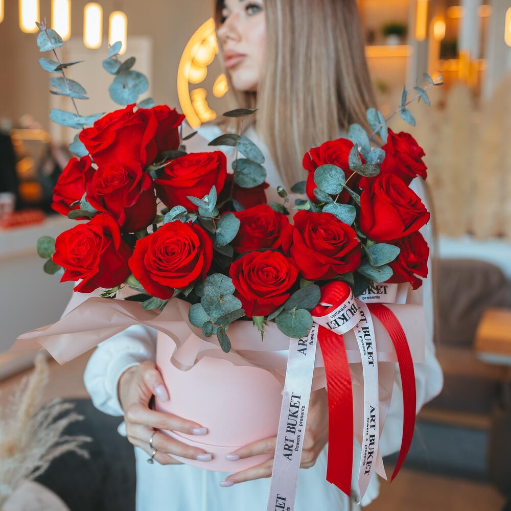 Rose red - 21 pcs Eucalyptus - 1 pcs