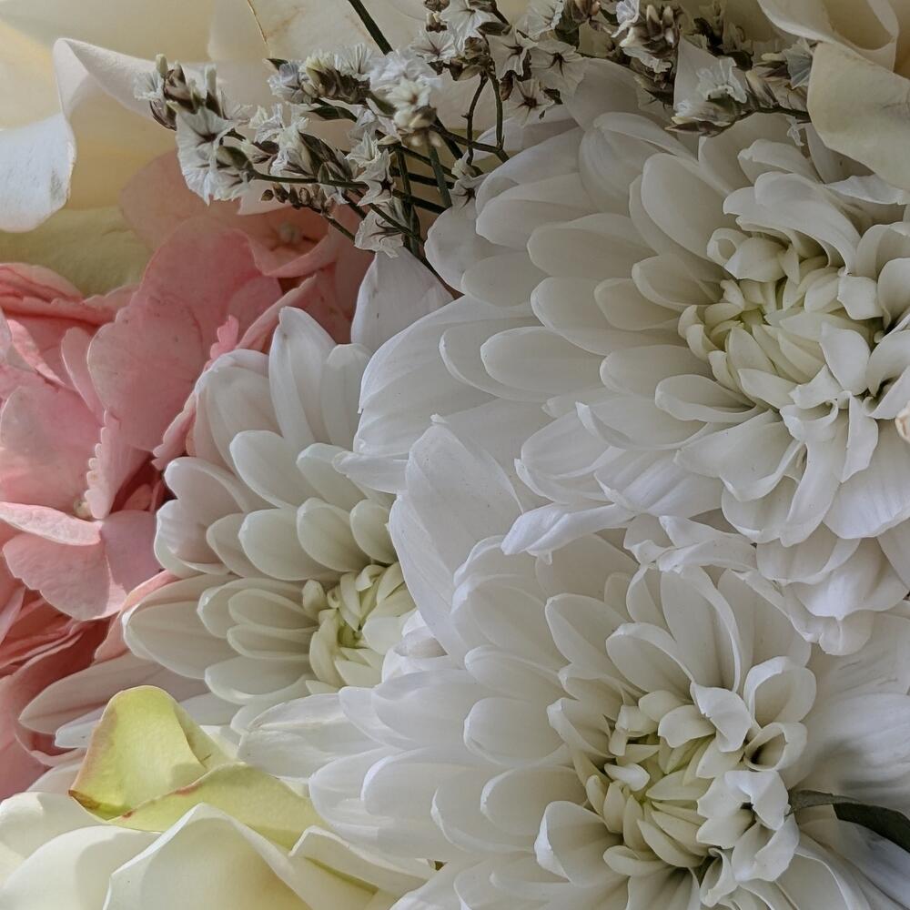 Hydrangea - 1 pcs Limonium - 2 pcs Chrysanthemum bush - 1 pcs Rose - 5 pcs
