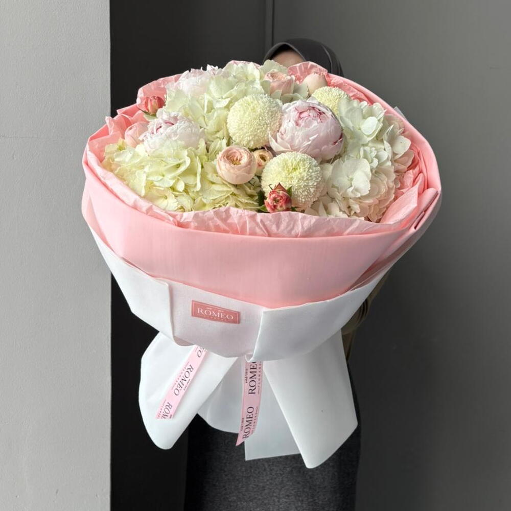 Hydrangea - 3 pcs Tape - 1 pcs Peony - 3 pcs Chrysanthemum one - headed - 3 pcs Decoration - 1 pcs Spray rose - 3 pcs