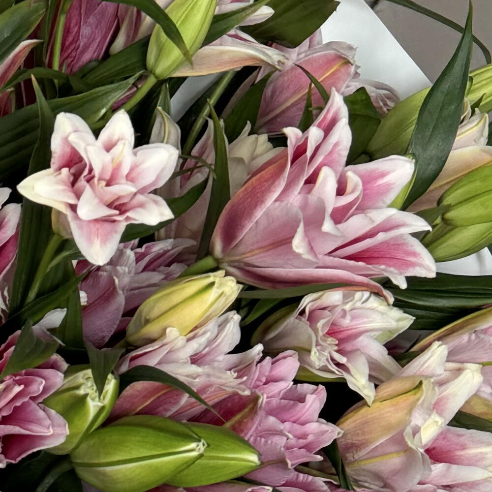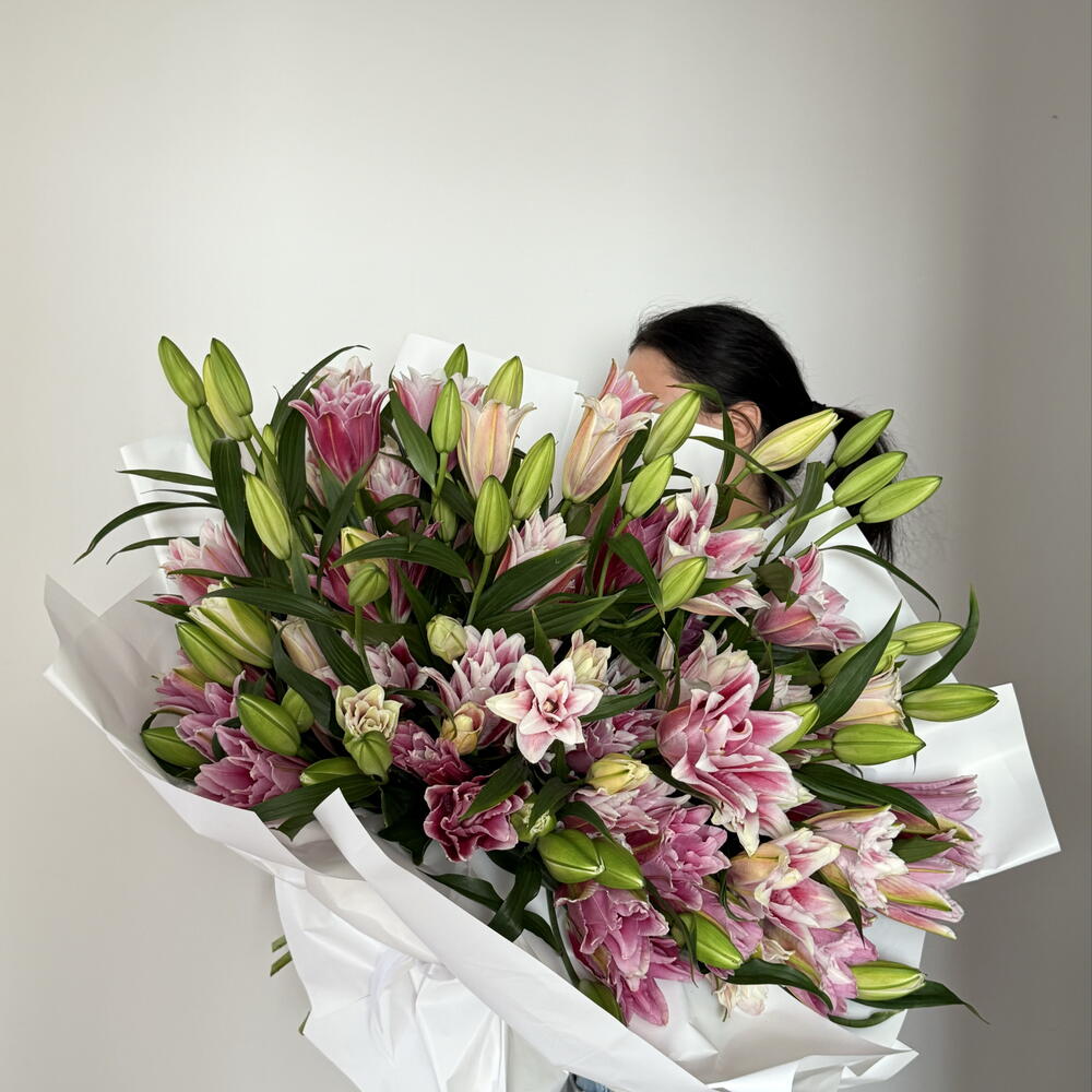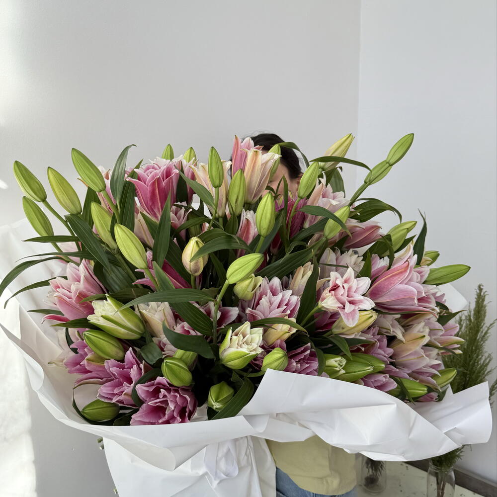 A gorgeous, truly impressive bouquet with large peony-like lilies - a story about grandeur, elegance and the power of beauty🤍 Voluminous, richly double flowers unfurl in lush waves of petals, creating an effect of regal luxury. Each bud - like a separate work of art, drawing the eye and filling the space with a special atmosphere.