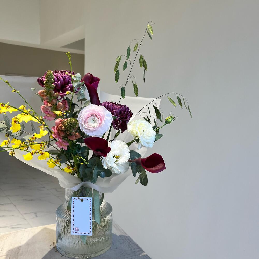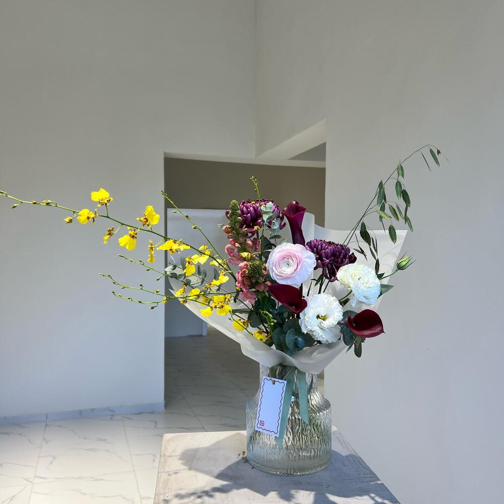 Eucalyptus - 4 pcs Chrysanthemum - 2 pcs Ranunculus - 1 pcs eustoma white - 2 pcs Calla red - 3 pcs oncidium yellow - 2 pcs львинный зев розовый - 2 pcs