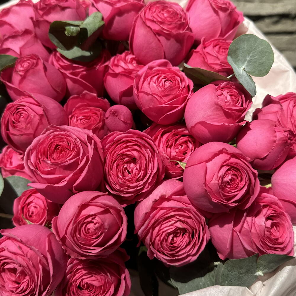 Яркие кустовые розы с эвкалиптом в дизайнерском оформлении.