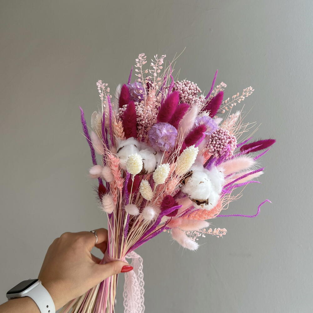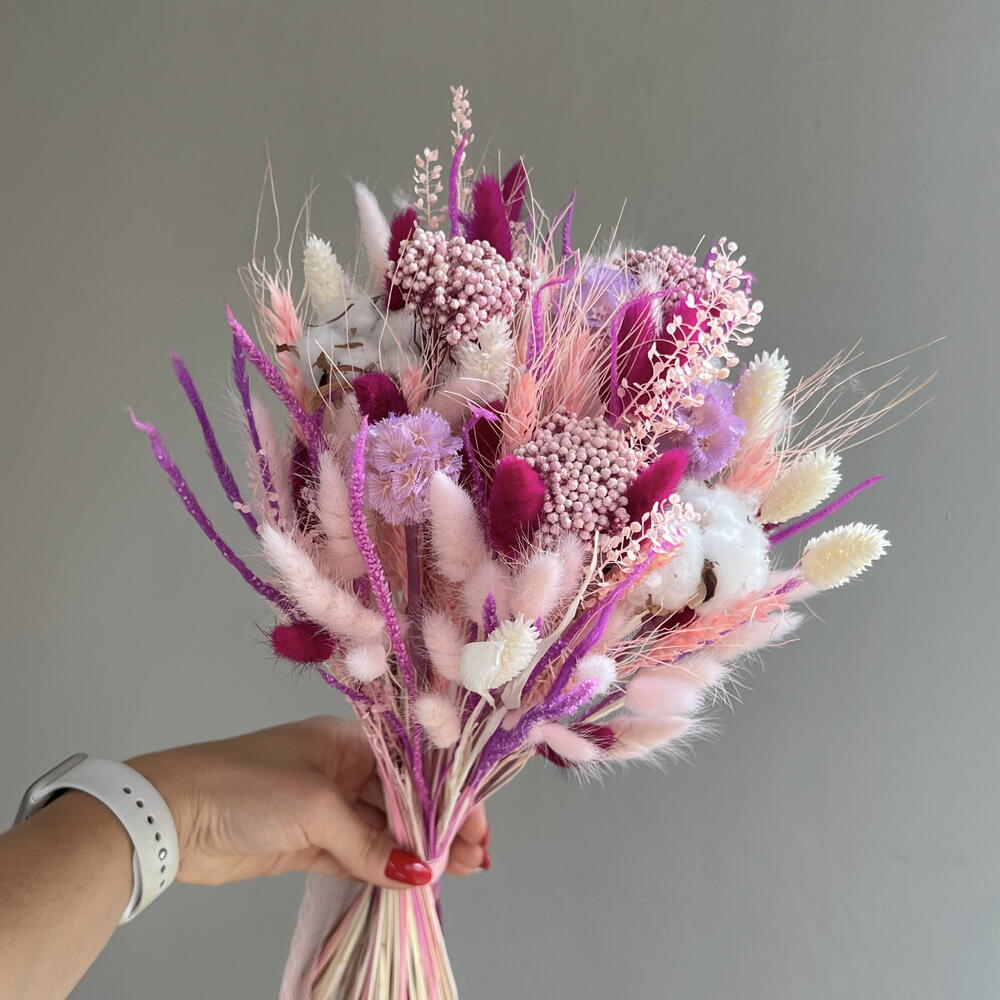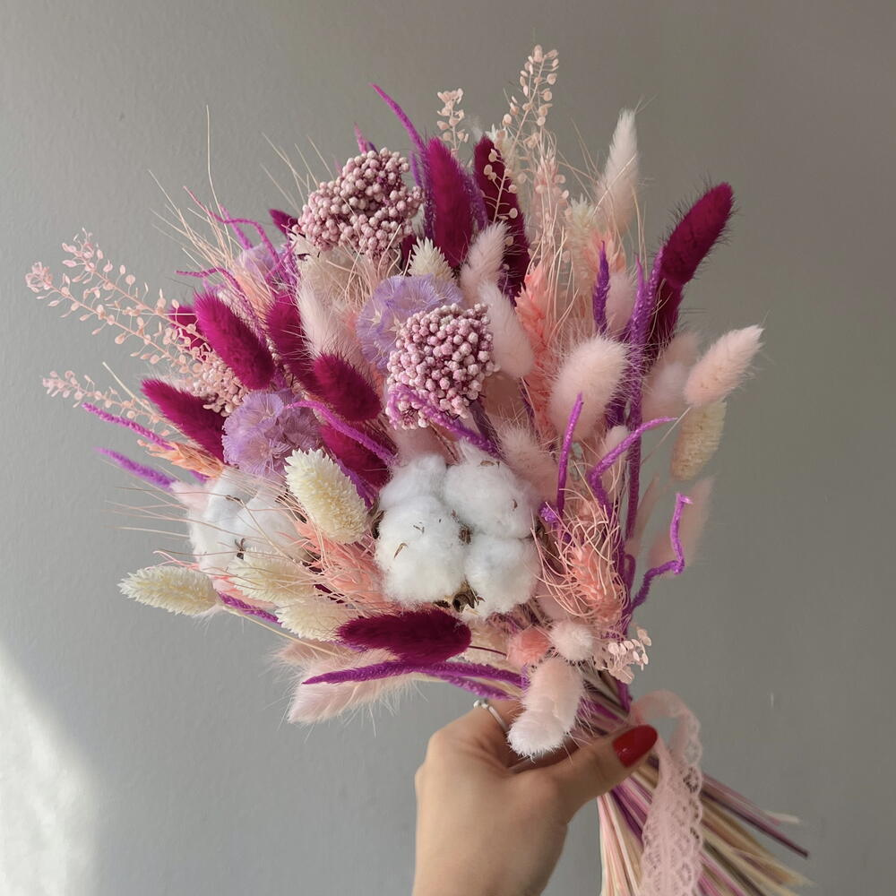 Ozothamnus - 3 pcs Scabiosis - 3 pcs Cotton - 3 pcs Wheat - 19 pcs Lagurus - 64 pcs Phalaris - 10 pcs Flume - 45 pcs green Bel - 3 pcs