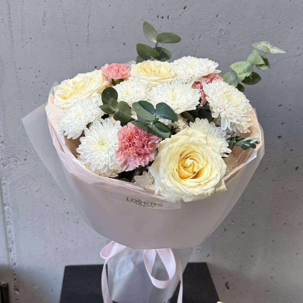 Chrysanthemum bush - 2 pcs Eucalyptus - 2 pcs Carnation - 3 pcs Peony - shaped rose - 3 pcs