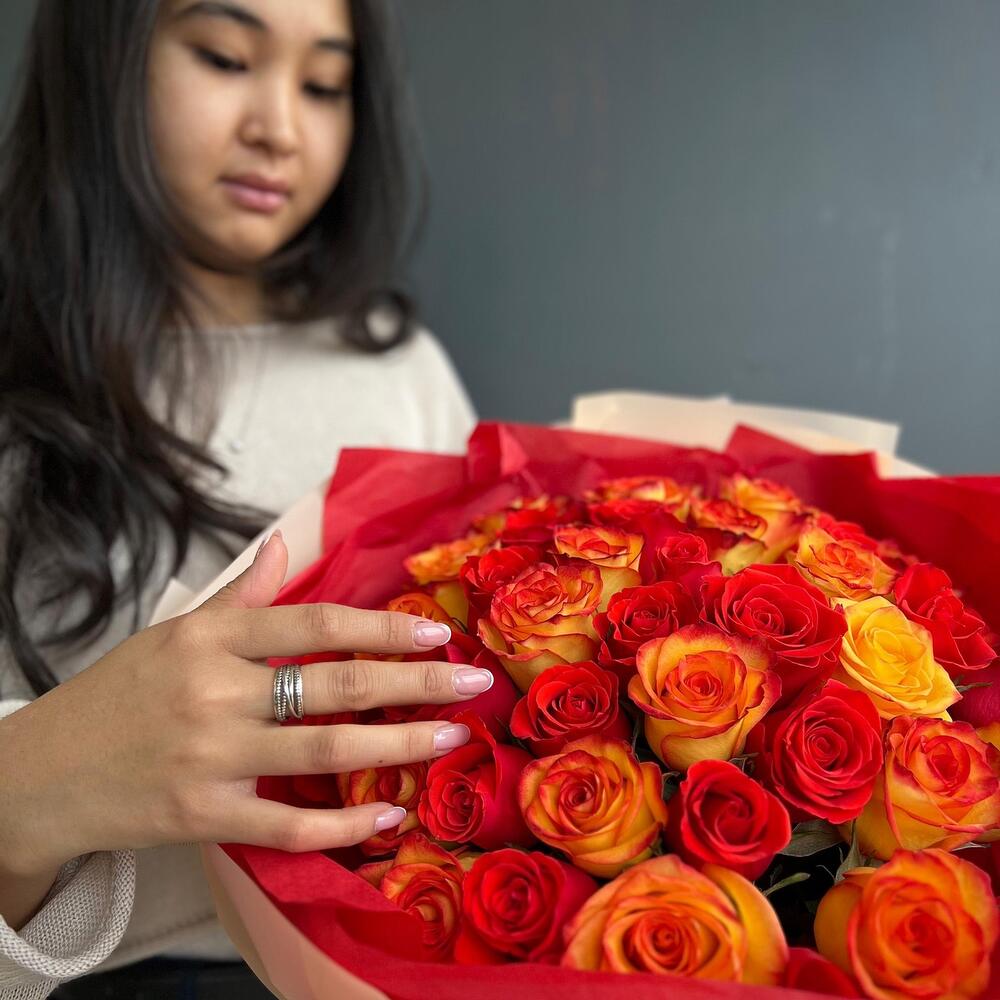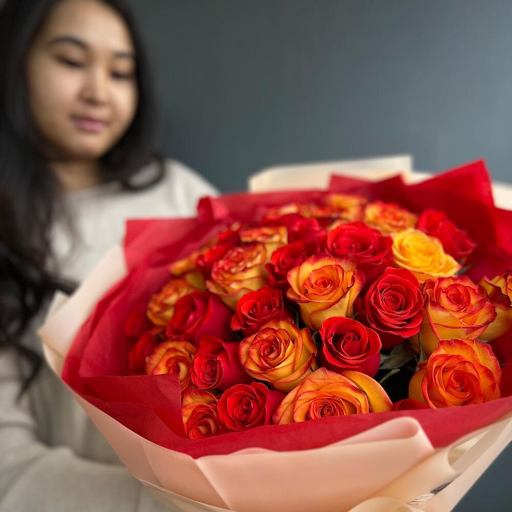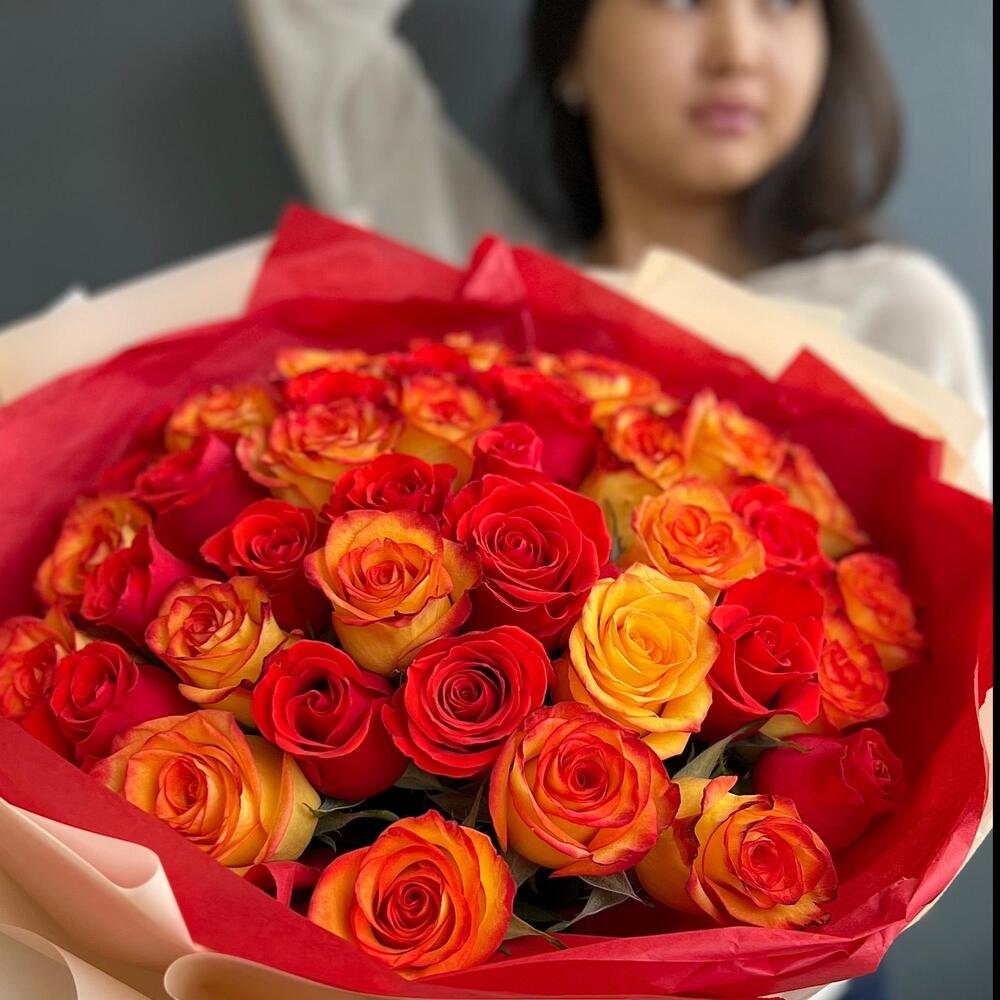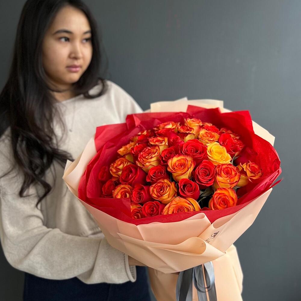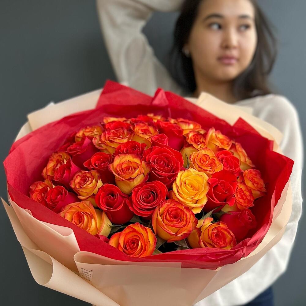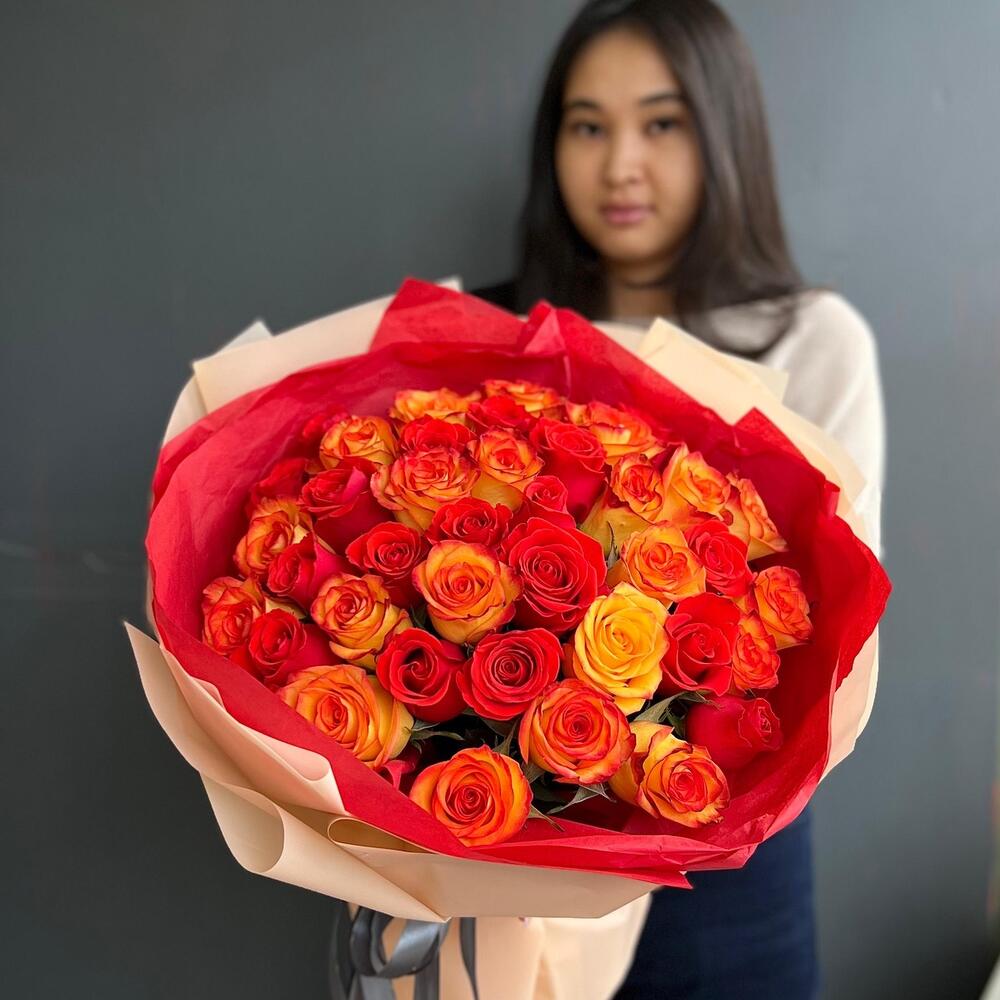 Яркий миск из 35 роз в фирменной упаковке (20.25)