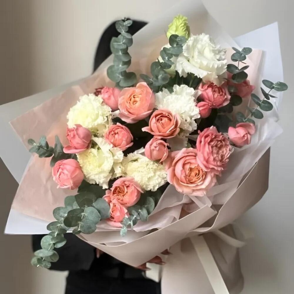Eucalyptus - 1 pcs peony - shaped bush roses - 5 pcs Lisianthus - 3 pcs