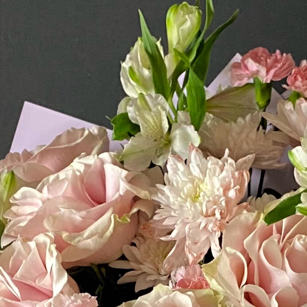 Alstroemeria - 3 pcs Chrysanthemum bush - 1 pcs Rose - 5 pcs Dianthus - 3 pcs Pistachio - 2 pcs A postcard with your wishes - 1 pcs Mica packaging - 1 pcs Design matte film - 1 pcs
