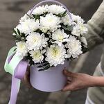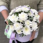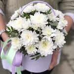 Eucalyptus - 1 pcs Hat box - 1 pcs Pistachio - 1 pcs Floral oasis - 1 pcs Chrysanthemum twig - 4 pcs satin bow - 1 pcs
