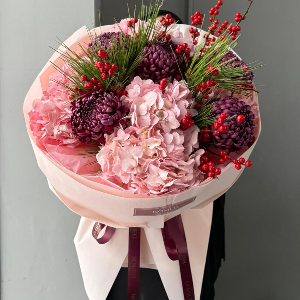 Hydrangea - 4 pcs Ilex - 3 pcs Tape - 1 pcs Chrysanthemum one - headed - 5 pcs Decoration - 1 pcs Pinus - 1 pcs