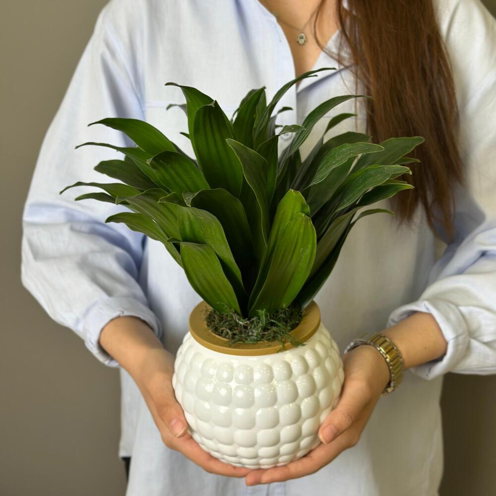 "Элегантное тропическое растение с узкими зелёными листьями. Драцена очищает воздух и прекрасно впишется в современный интерьер. Уход: светлое место без прямых солнечных лучей, умеренный полив, опрыскивание.
