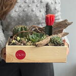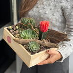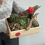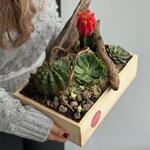 Флорариум в деревянном ящике с гимнокалициумом, цветущим кактусом и суккулентами