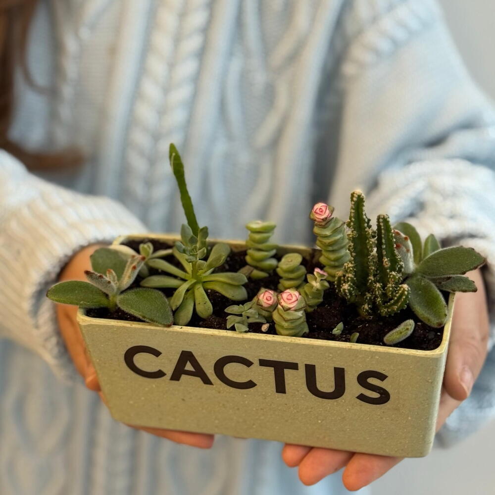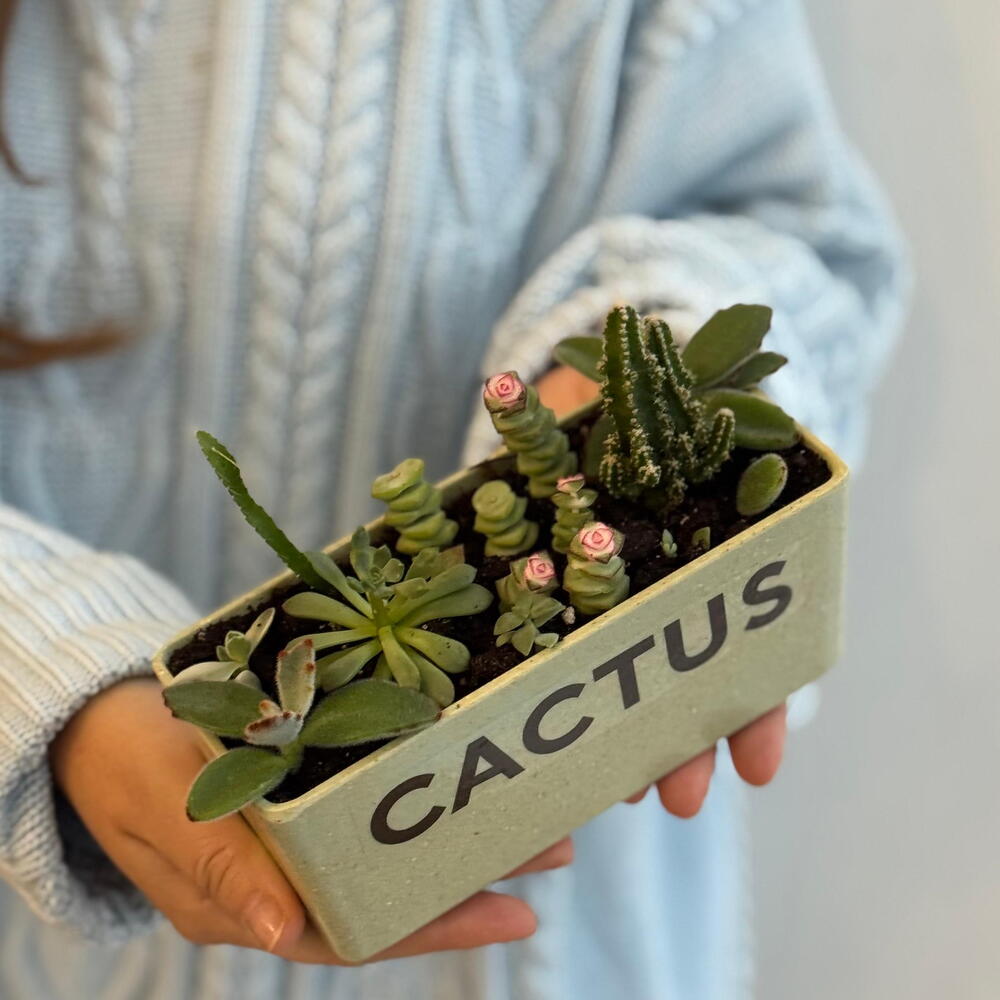 Мини сад из суккулентов и кактусов в прямоугольном кашпо