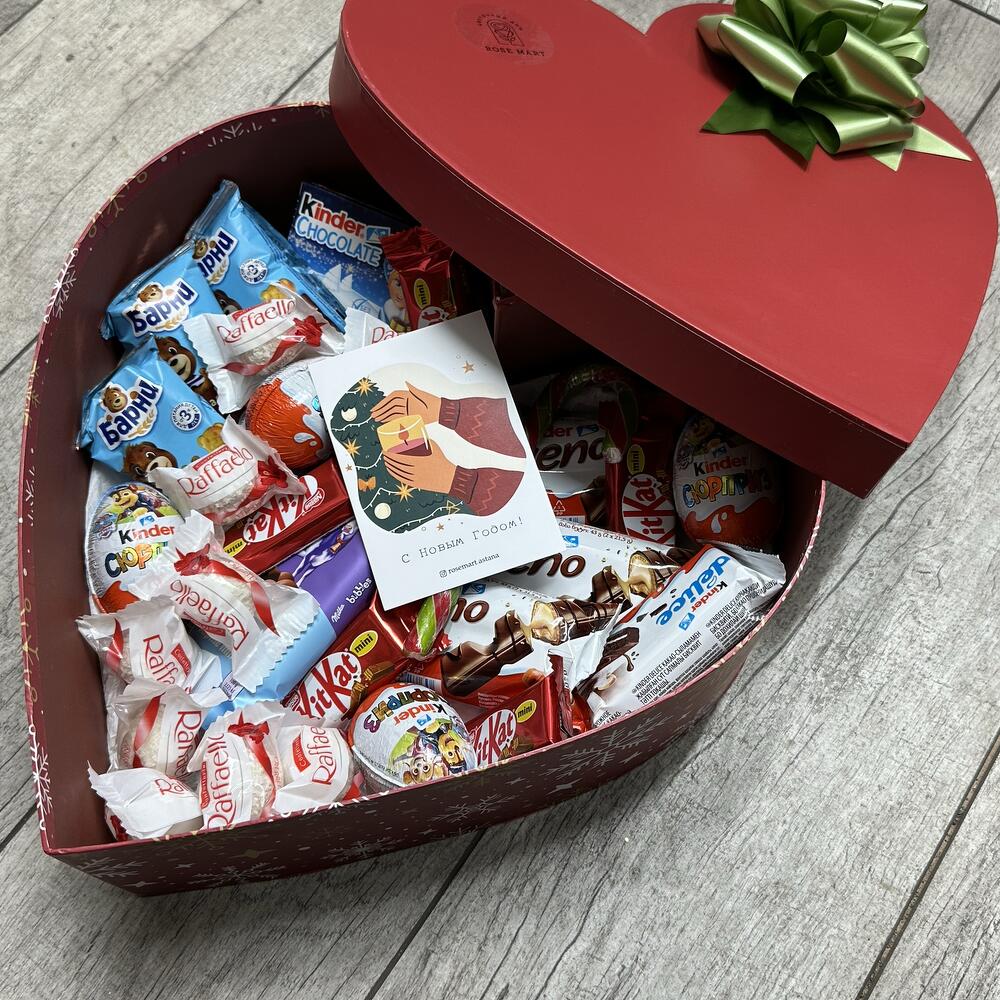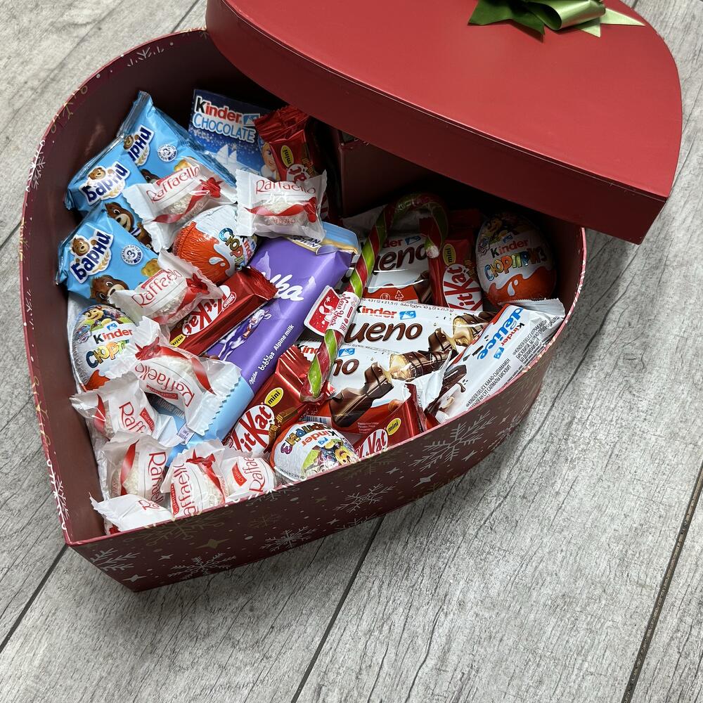 Raffaello - 10 pcs Kinder surprise - 4 pcs KitKat - 5 pcs Kinder chocolate - 2 pcs Barney - 3 pcs Milka chocolate - 1 pcs Bueno - 3 pcs cane caramel - 1 pcs