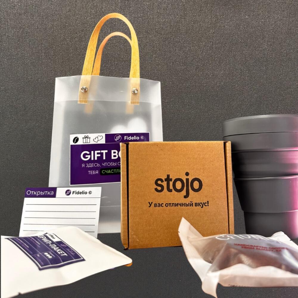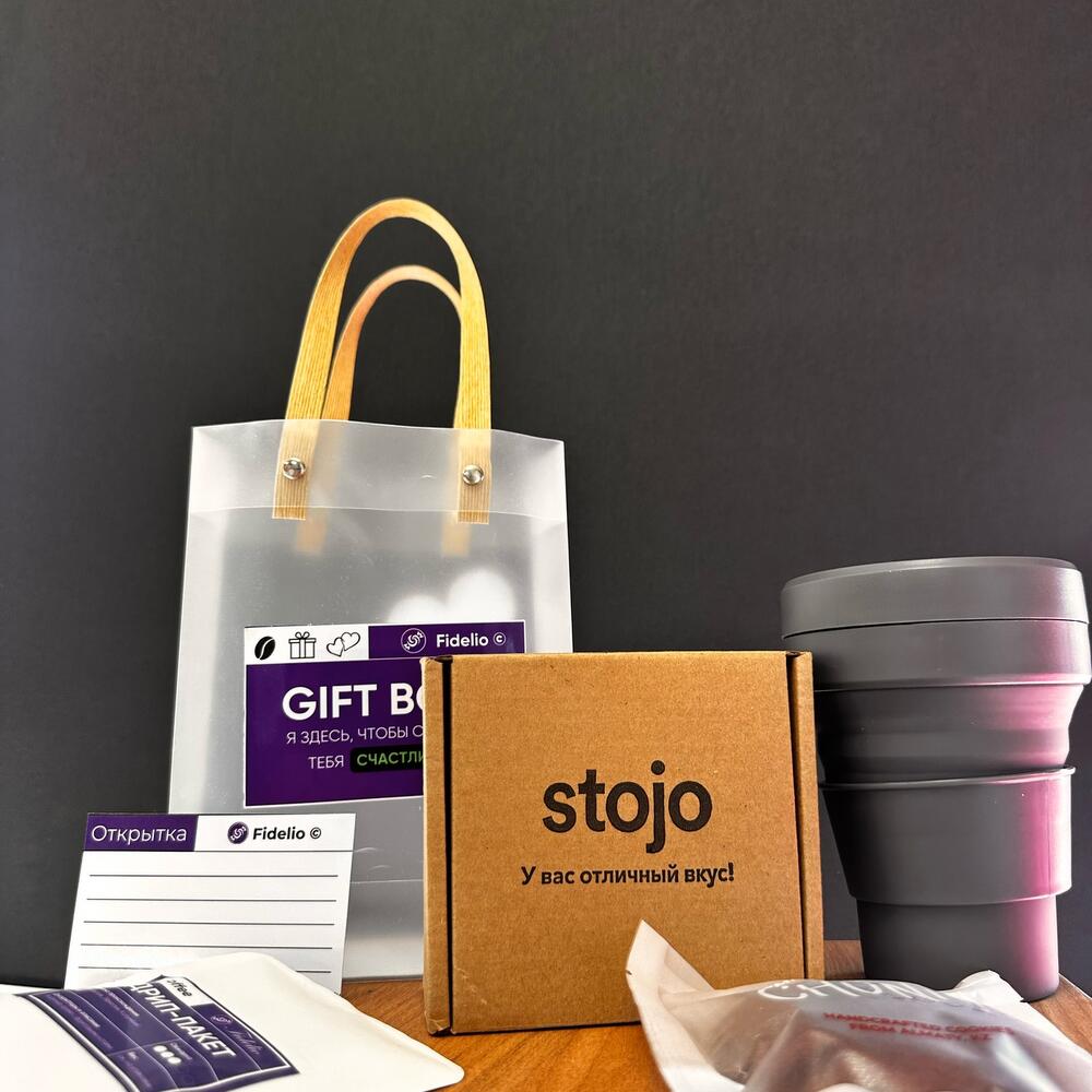 Postcard - 1 pcs bag - 1 pcs stojo стакан - 1 pcs дрип-пакет fidelio - 2 pcs chunky печенье - 1 pcs