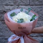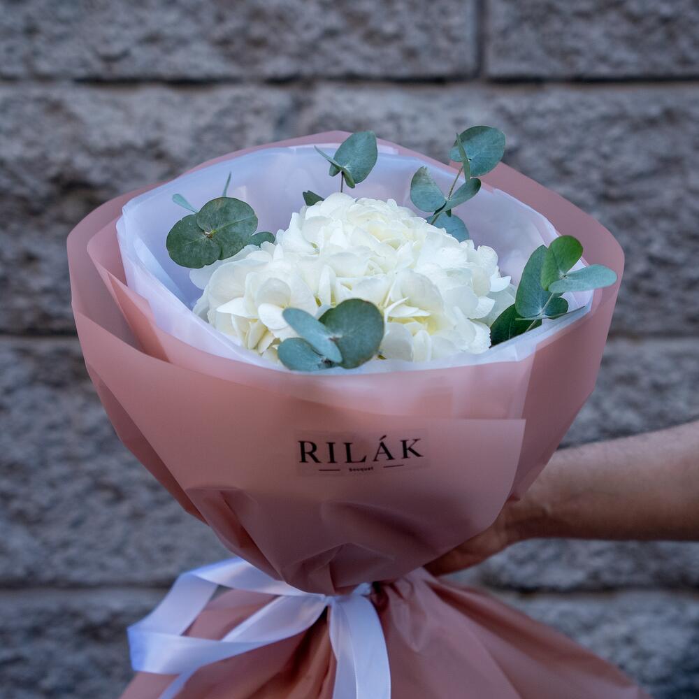 Роскошная белая королевская гортензия с добавлением эвкалипта в пышном и объёмном оформлении.