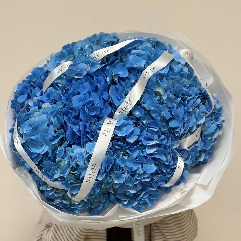 Букет из 13 синих гортензий — это эффектная и благородная композиция, наполненная глубиной и элегантностью. Насыщенный синий оттенок символизирует искренность, уверенность и спокойствие. Такой букет станет роскошным акцентом для особого случая или выразительным подарком, который точно запомнится.