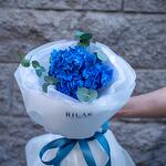 Роскошная синяя королевская гортензия с добавлением эвкалипта в пышном и объёмном оформлении.