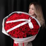 Голландские розы насыщенного алого цвета — символ горячих чувств. Роскошный подарок в стильной белой упаковке для самой важной женщины.