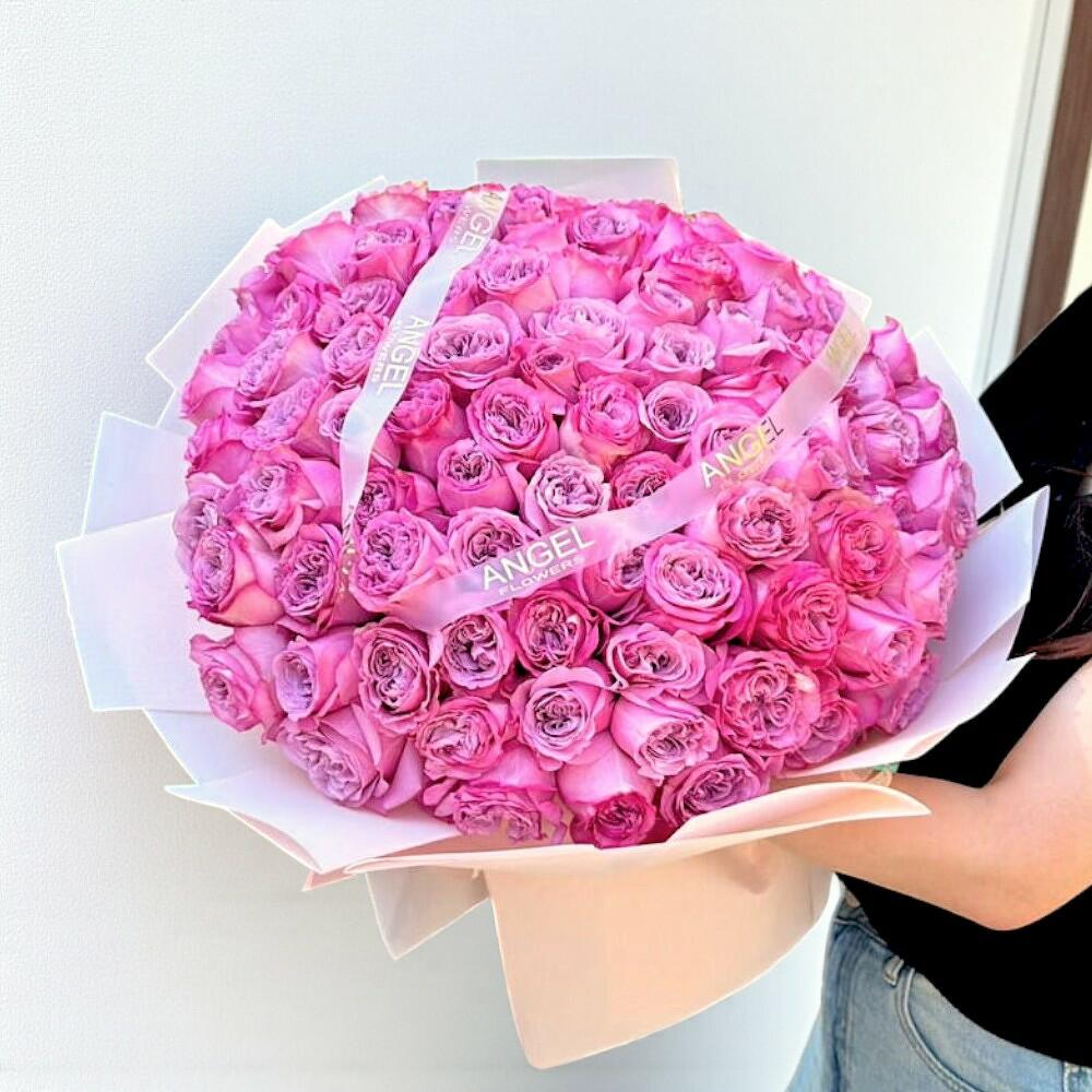 Роскошный букет из 101 яркой розовой розы поражает воображение своим объемом и насыщенным цветом лепестков. Идеальный подарок для признания в любви, на юбилей или в особенный день, когда хочется подарить максимум эмоций. Каждая роза раскрывается пышным бутоном, создавая густое, бархатное облако из нежного аромата. Букет оформлен в стильную светлую упаковку с фирменной лентой ANGEL, подчёркивающей элегантность композиции. Чтобы букет радовал дольше, обновляйте воду в вазе каждые 1–2 дня, подрезайте стебли на 1 см под углом и держите его вдали от прямых солнечных лучей и сквозняков.