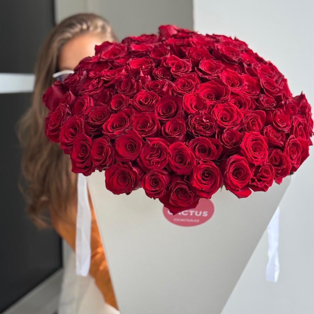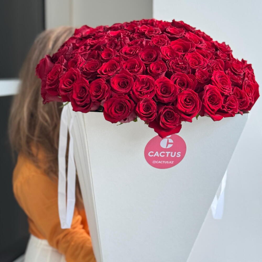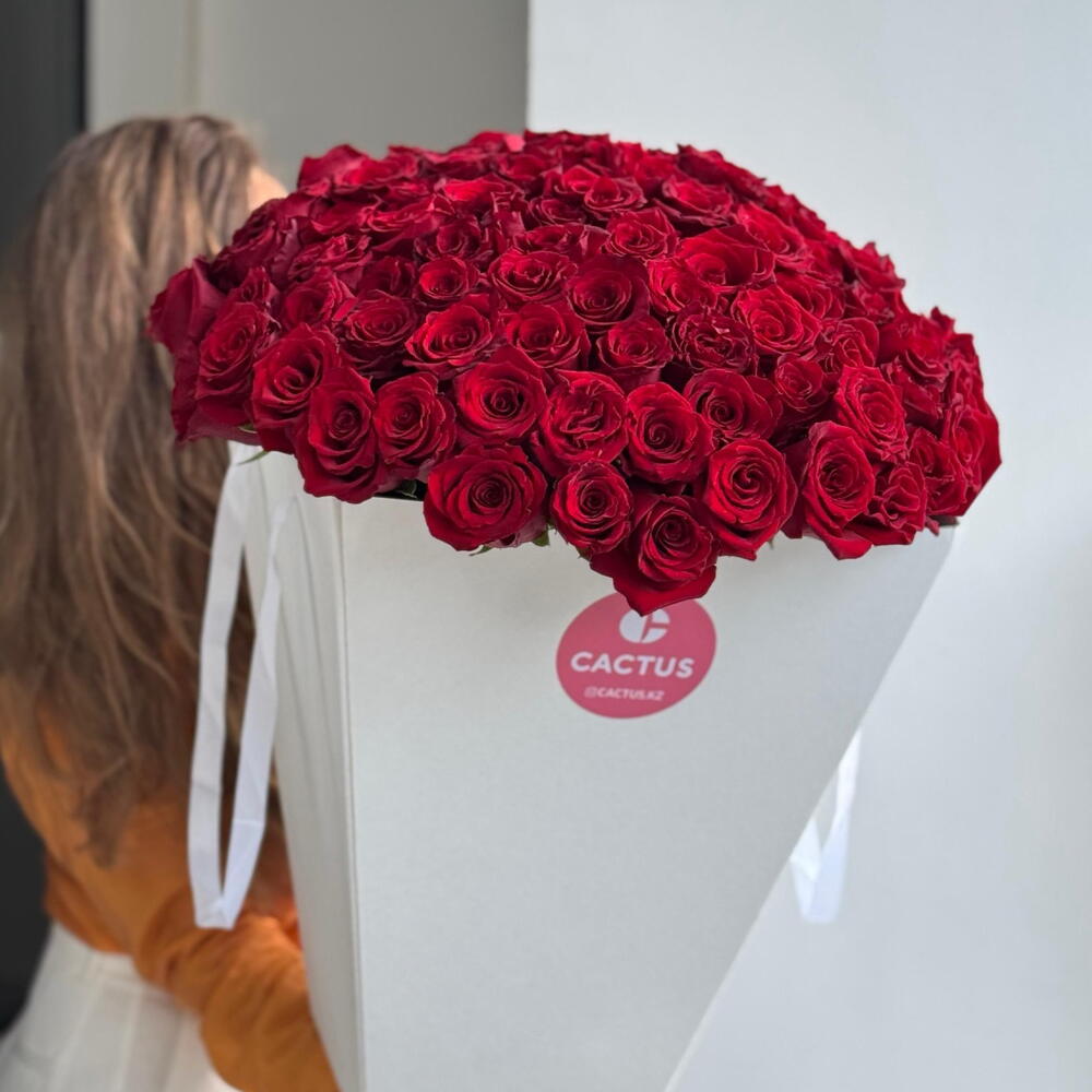 Роза красная - 101 шт. Бант - 1 шт. переноска для цветов - 1 шт.