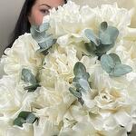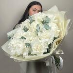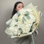 Эвкалипт - 7 шт. Лента атласная - 5 шт. Роза пионовидная - 11 шт. дизйнерская упаковка - 3 шт.