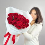 Букет из 15 красных роз — это сдержанная элегантность и чистота чувств. Свежие бутоны с плотными лепестками собраны в аккуратную композицию и оформлены в нежно-розовую матовую упаковку, которая подчёркивает благородный оттенок цветов. Белые розы символизируют искренность, заботу и уважение, делая букет универсальным подарком для особого повода или тёплого знака внимания без лишних слов.