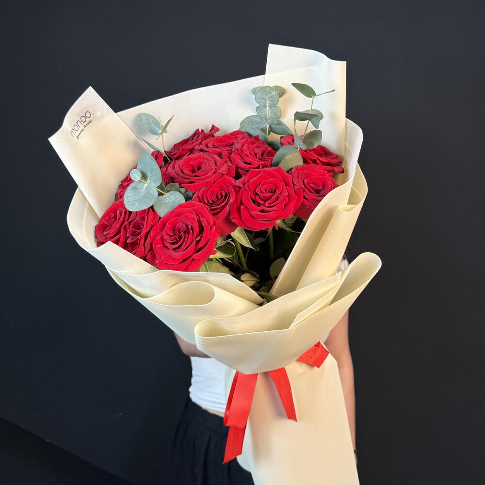Эвкалипт - 4 шт. красные розы - 13 шт.