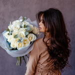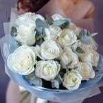 Лента - 1 шт. Эвкалипт - 2 шт. Роза белая - 19 шт. Оформление - 1 шт.