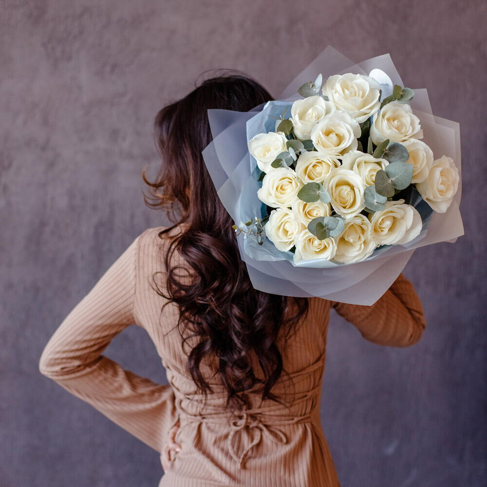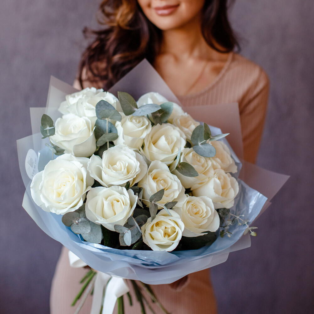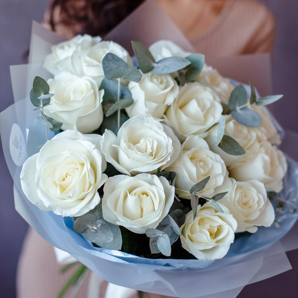 Лента - 1 шт. Эвкалипт - 2 шт. Роза белая - 19 шт. Оформление - 1 шт.