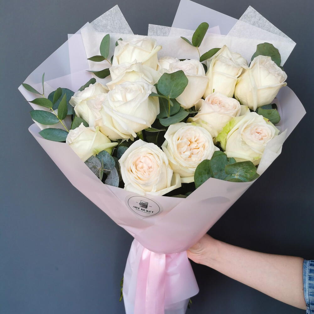 Лента - 1 шт. Эвкалипт - 2 шт. Оформление - 1 шт. пионовидная роза white ohara - 15 шт.