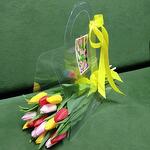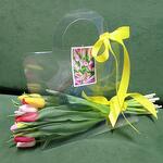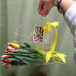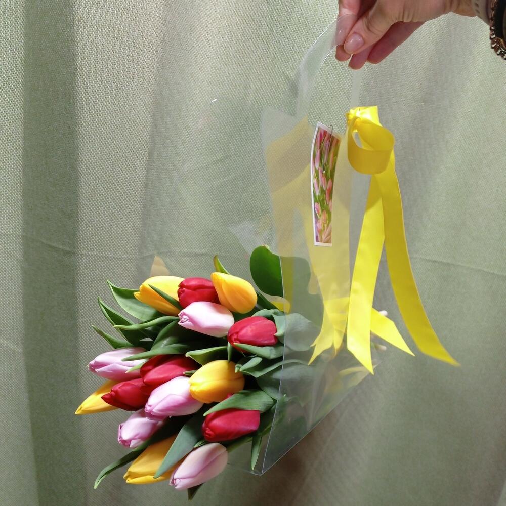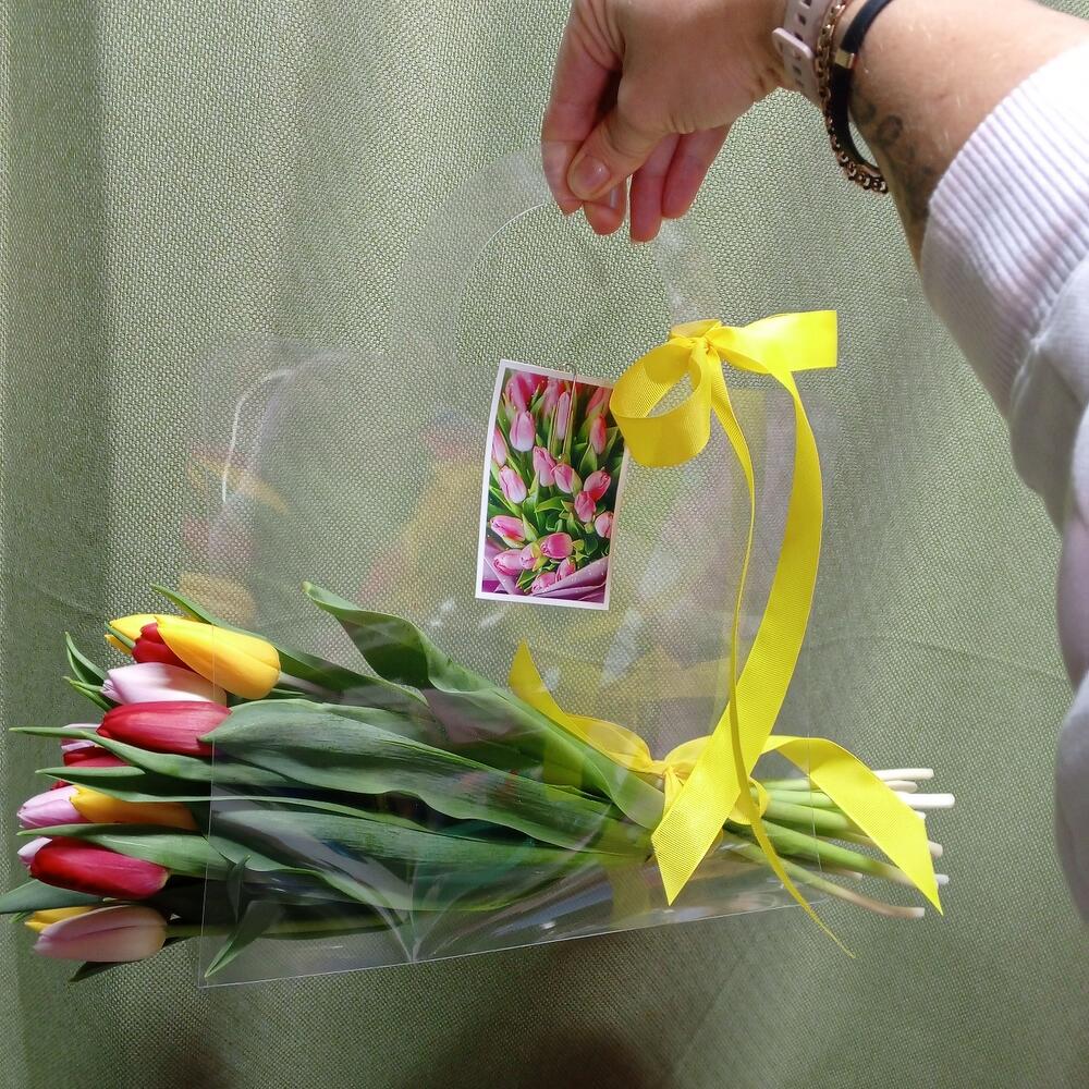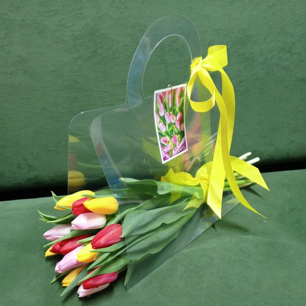 Весенний моно букет из тюльпанов в прозрачной сумочке.