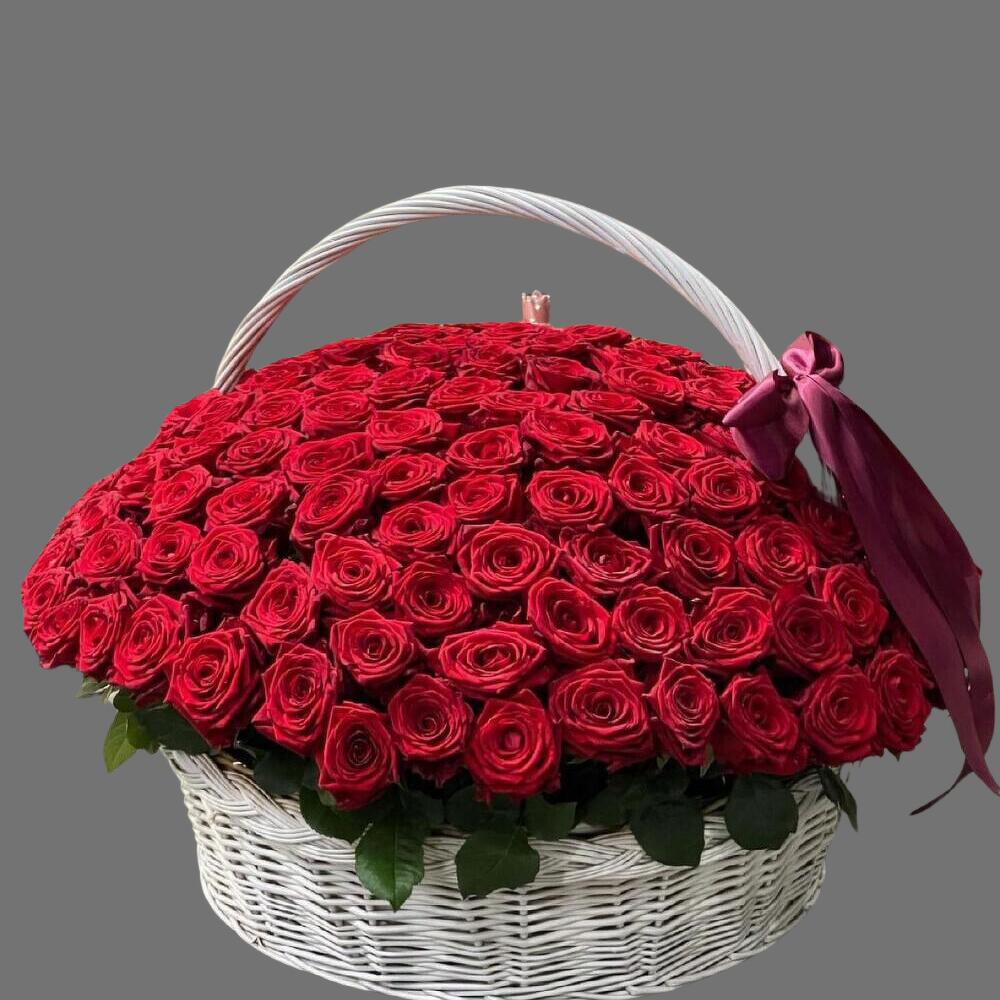Роскошная композиция из красных роз в элегантной плетёной корзине. Идеальный выбор для выражения пылких чувств, признания в любви или эффектного поздравления.