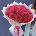 Лента - 1 шт. Розовая роза - 21 шт. Оформление букета - 1 шт.