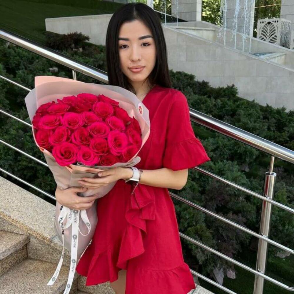 25 голландских роз от Оранж Алматы. Вы можете согласовать цвет роз заранее. Получить фото до и после отправки букета. Открытка в подарок.